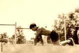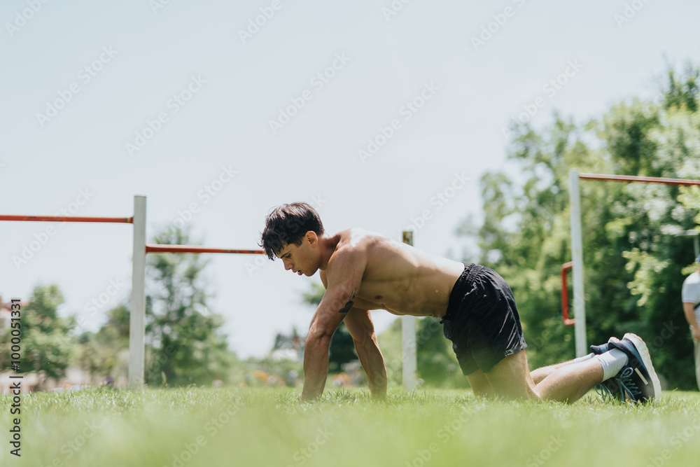 Fit man exercising in nature, performing an outdoor workout routine in a park on a sunny day.