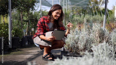 Female agricultural engineer using a digital tablet and planning planting at the garden center