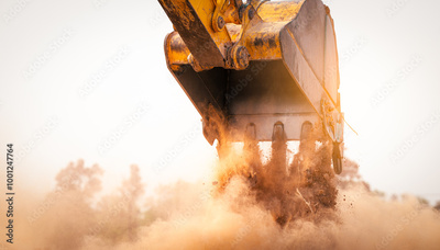 Backhoe working by digging soil at construction site bucket of crawler excavator breaking ground for new development project earth moving machine in action. Foundation work on construction project.