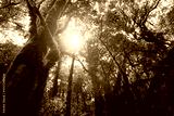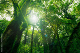 Looking up view of tree trunk to green leaves of tree in forest with sun light. Fresh environment in green woods. Forest tree on sunny day. Natural carbon capture. Sustainable conservation and ecology