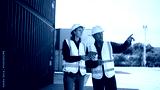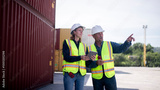 Engineer or dockworker working in the construction container dock yard checking and inspection containers data on computer program environment is container shipping Logistics business concept.