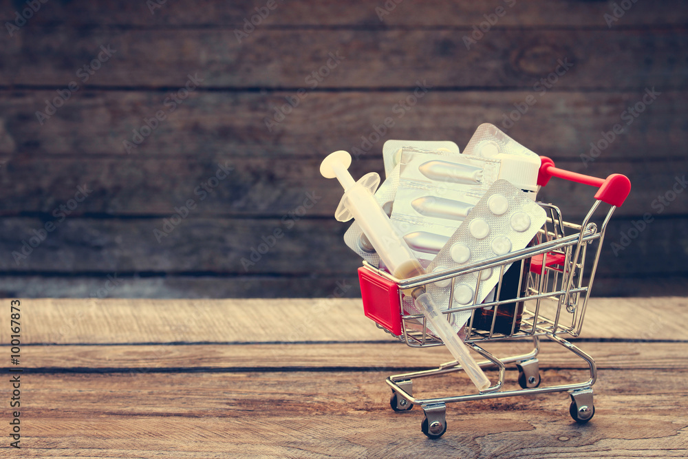 Shopping cart with pills, a syringe, candles on the old wood background. Toned image.