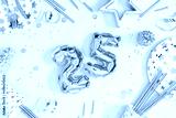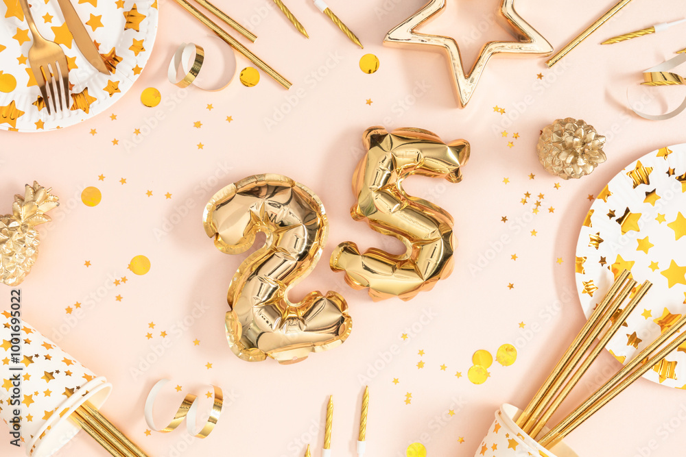 Number 25 balloon celebration. Glamorous 25th birthday party setting with gold balloons, confetti and cutlery on pink background creating a festive and elegant atmospher