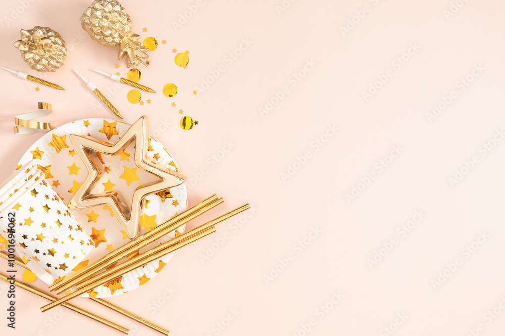 Christmas festive background, golden Christmas decorations on light background. top view, flat lay.