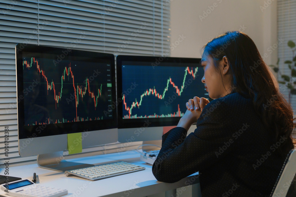 Businesswoman is analyzing stock market data on multiple computer screens, working late at night in her office