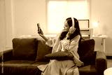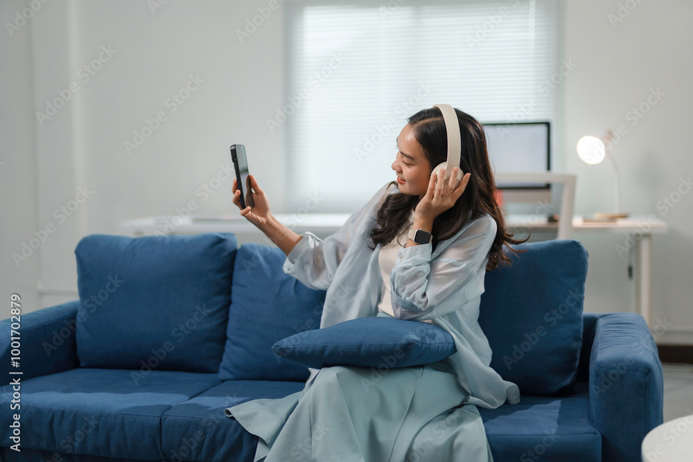 Young woman is sitting on a blue sofa at home, wearing headphones, and having a video call on her smartphone