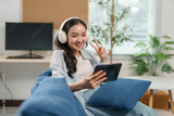 Young woman is making a video call with her tablet while sitting on a comfortable sofa, wearing headphones, and gesturing with a peace sign