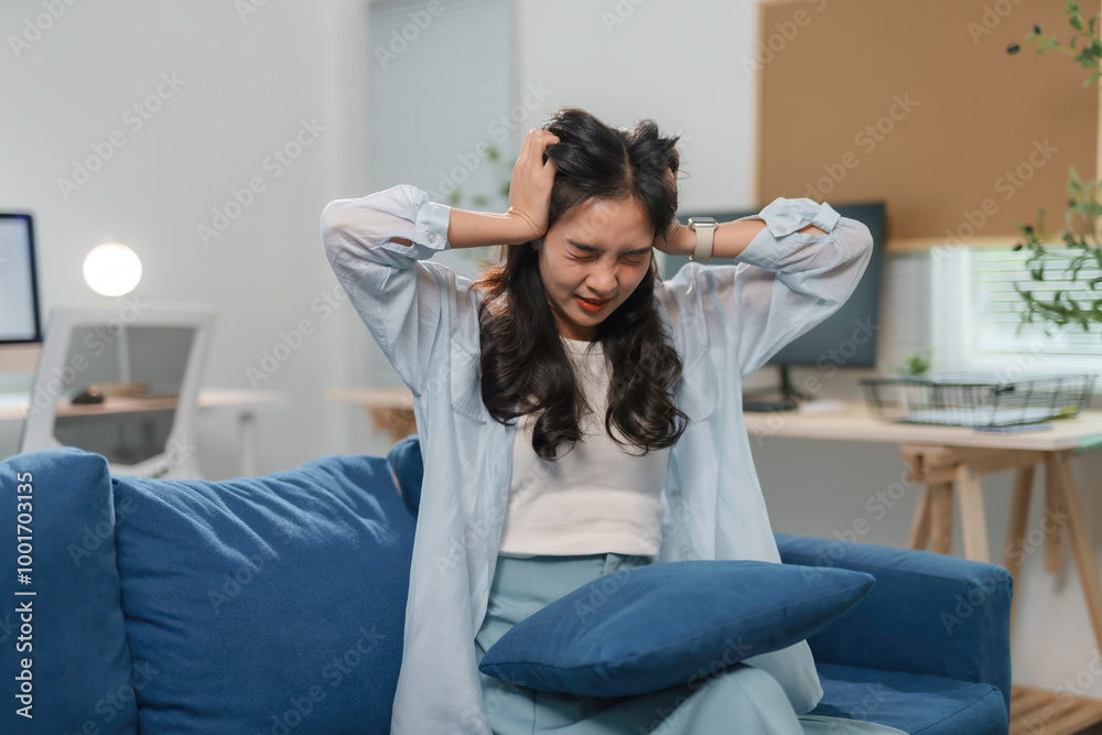 Young woman is sitting on a sofa and holding her head with her hands, suffering from a headache