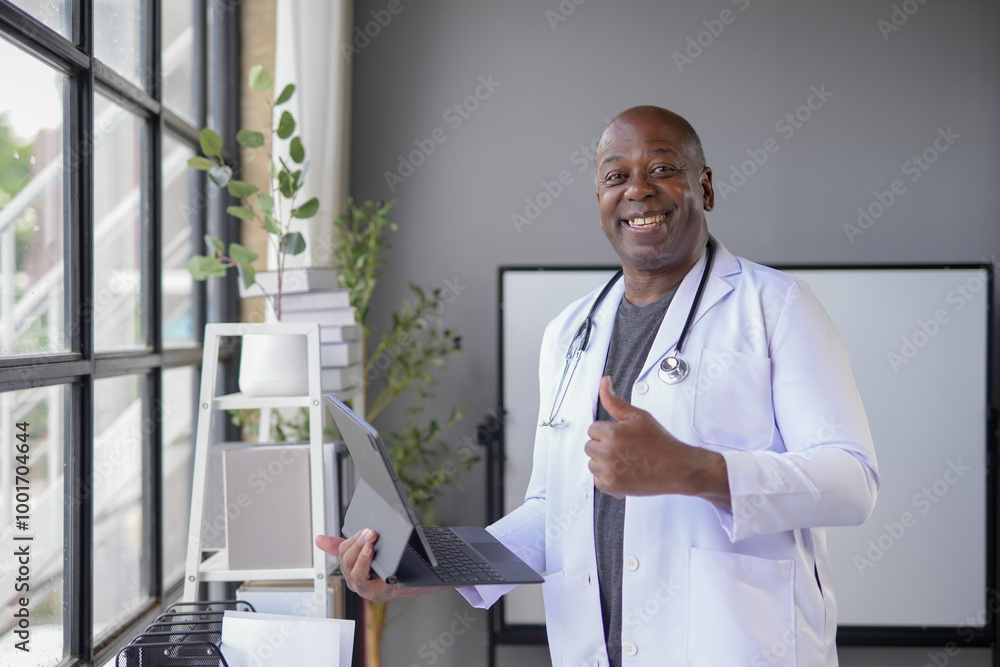 Male doctor is holding a laptop and showing thumbs up while smiling in his bright office
