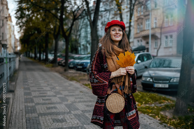 smiling trendy woman in red hat with autumn leafs walking