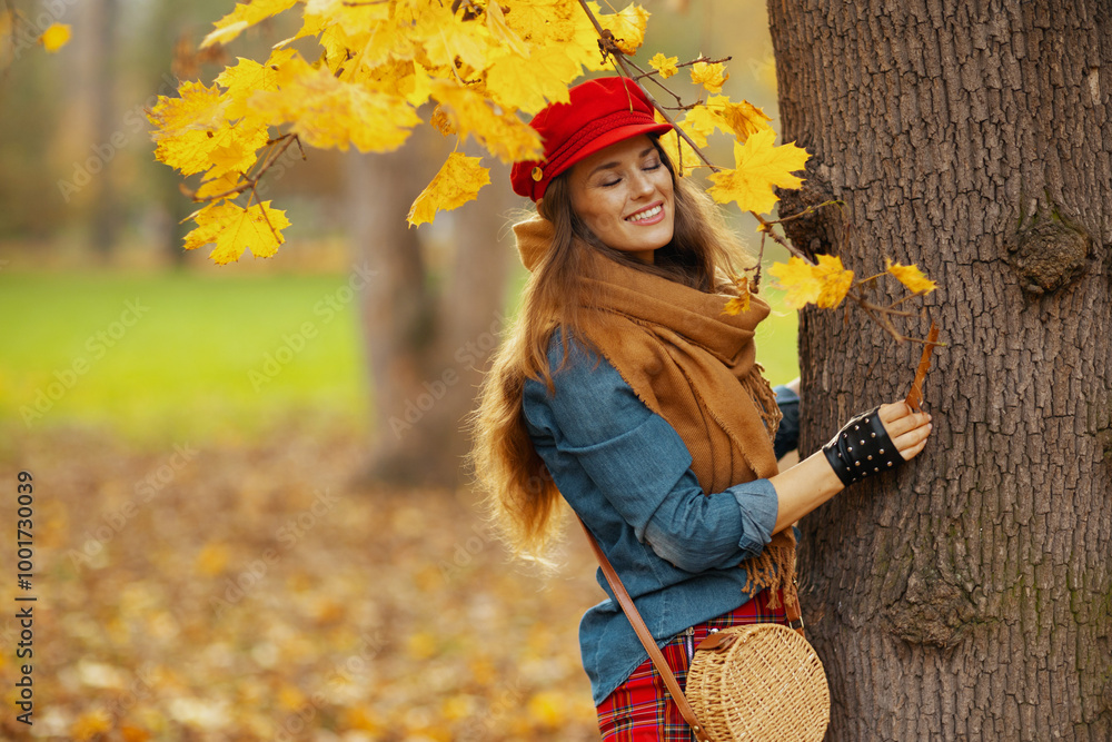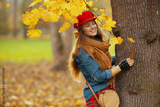 relaxed trendy 40 years old woman in jeans shirt and red hat