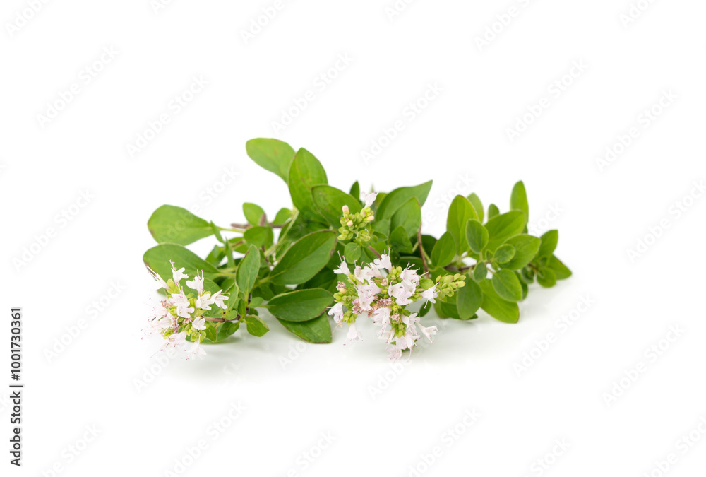 Fresh thyme twig isolated, fresh marjoram leaves, oregano sprig, green thyme seasoning leaf, thyme leaves