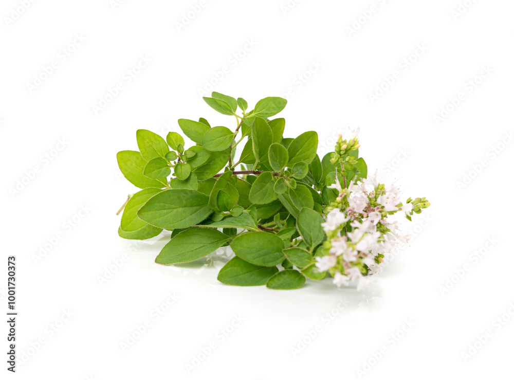 Fresh thyme twig isolated, fresh marjoram leaves, oregano sprig, green thyme seasoning leaf, thyme leaves