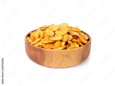 Roasted broad beans snack isolated, fried vicia faba, spicy legume, crispy big beans chips for salads