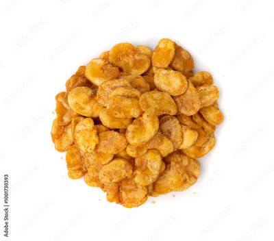 Roasted broad beans snack isolated, fried vicia faba, spicy legume, crispy big beans chips for salads