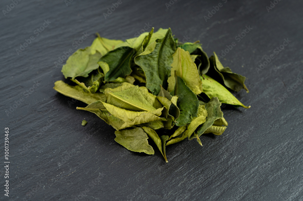 Thai lime dried leaves, makrut lime or Citrus hystrix leaf pile, kaffir lime dry sprouts, Southeast Asia spices