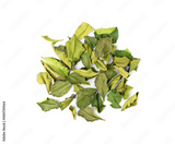 Thai lime dried leaves isolated, makrut lime or Citrus hystrix leaf pile, kaffir lime dry sprouts, Asia spices