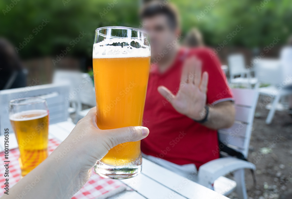 Reject a glass of beer, woman refusing alcohol, stop drinking, sobriety concept, saying no to beer glass