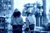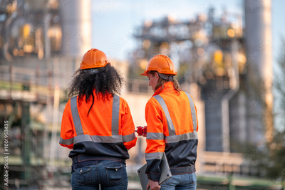 Engineers wear safety gear examining survey holding tablet extensive setup of industrial piping, and structures a complex engineering or energy production site safety environment gas or oil refinery.