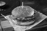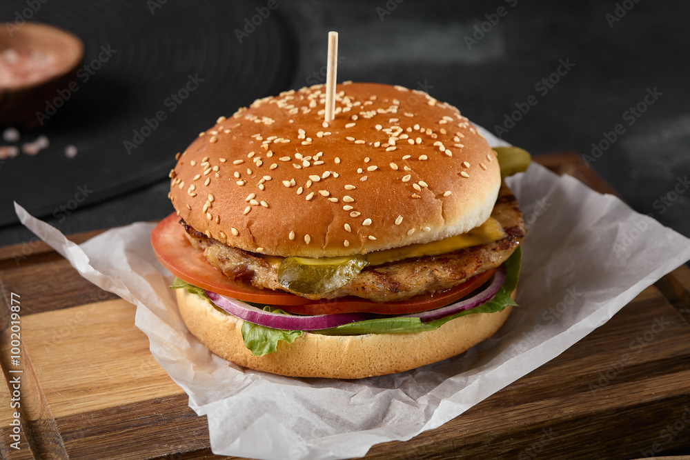 Delicious Chicken Burger with Fresh Ingredients on Wooden Board - High-Contrast Food Photography