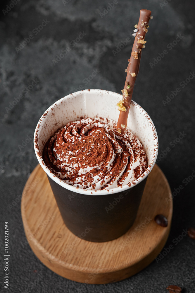 Elegant Cup Tiramisu Rustic Dark Lighting and Textured Background - Coffee Dessert Stock Photo