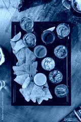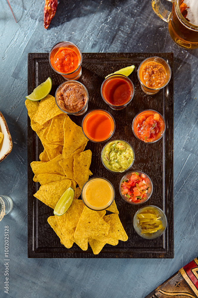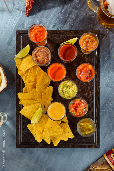Vibrant Assortment of Dips and Sauces with Nacho Chips on Rustic Wooden Platter