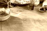Sunlit Rustic Table Setting with Fresh Herbs and Vegetables for Outdoor Dining