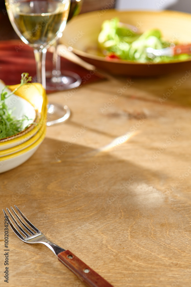 Bright Rustic Table Setting with Wine, Salad, and Sunlit Details