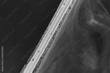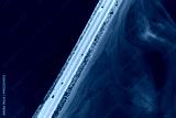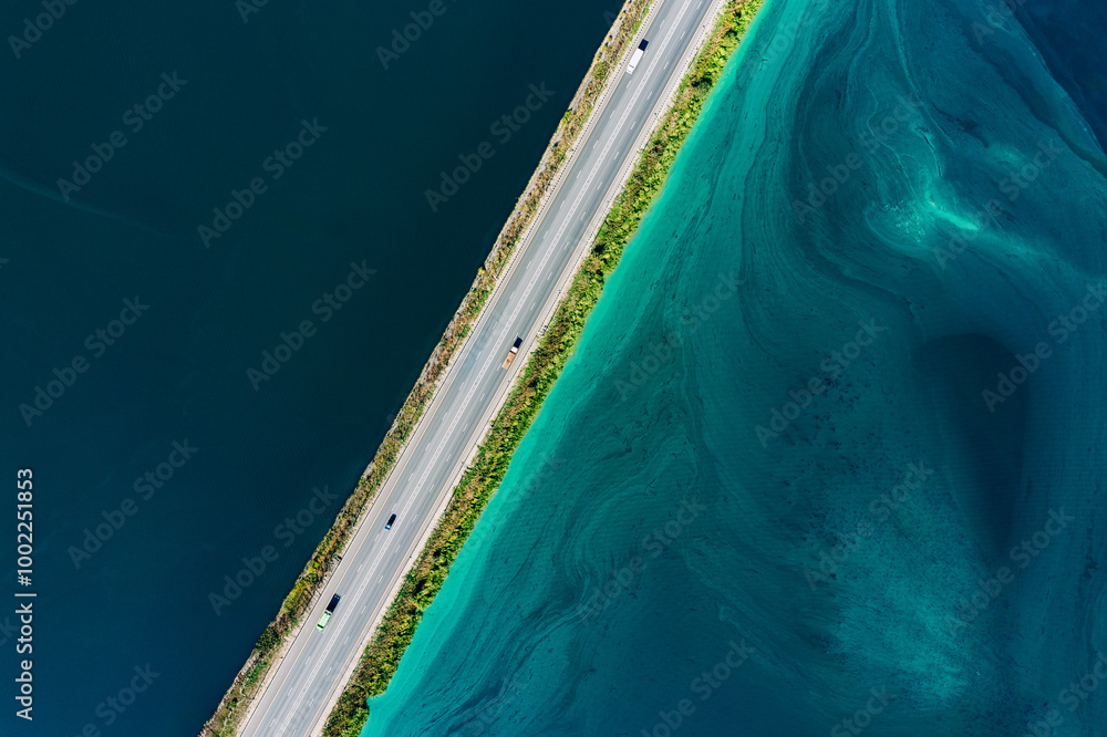 Aerial view of asphalt bridge road with cars and truck cargo between blue and turquoise water river sea ocean.