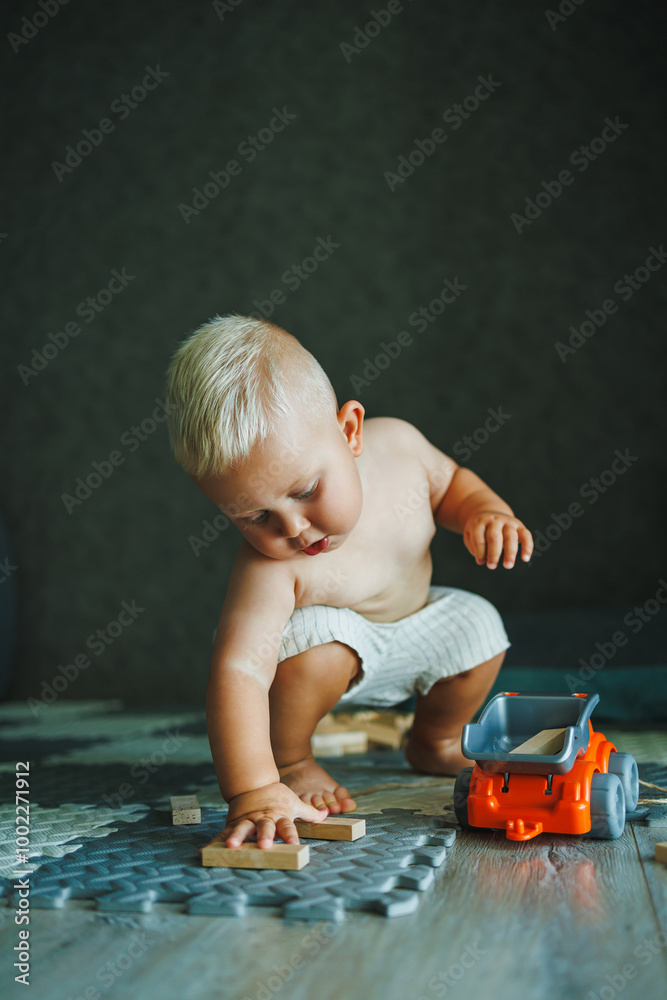 A toddler boy in shorts runs around the apartment at home. The child is playing at home. Active entertainment at home with the child.