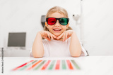 A modern approach to orthoptic therapy for comfortable vision treatment in children. A cheerful girl wearing vision stimulation glasses highlights the importance of an engaging restoration process.