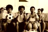 Brazilian family watching a football game with fingers crossed