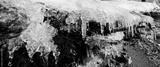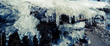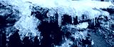 Melting ice floe with icicles lays on the coast