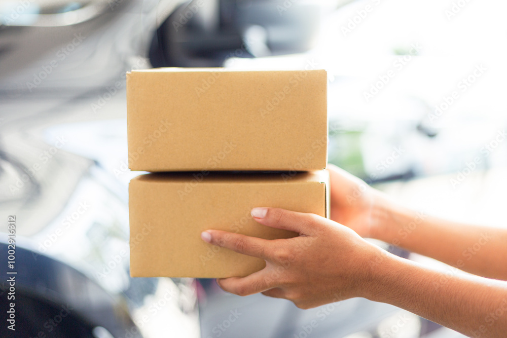 Parcel box and human hand. Customer signs documents and receives parcel from delivery man. Delivery woman hands over box.