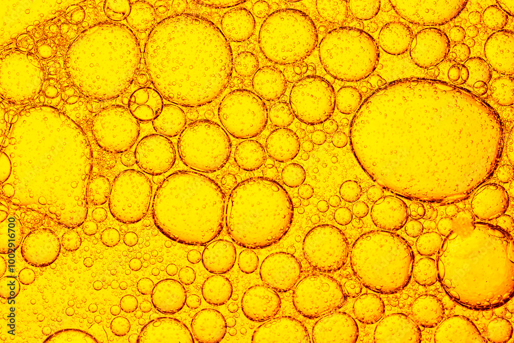 Yellow drink bubbles macro,water drops on a yellow background,Yellow bubbles and drops of oil background . Yellow water bubbles wallpaper
