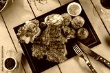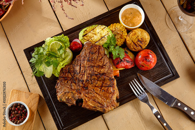Juicy T-Bone Steak with Grilled Vegetables on Rustic Wooden Table - High Contrast, Warm Lighting