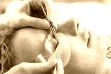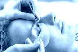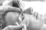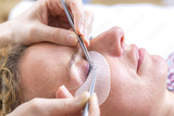 Eyelash Extension Procedure. Woman Eye with Long Eyelashes.