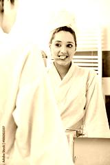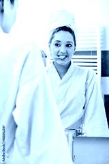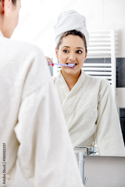 Beautiful woman cleaning her teeth in the bathroom in the morning.