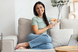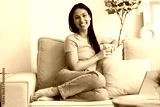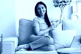 Pretty young woman working with her laptop while drinking a cup of coffee sitting on a couch at home
