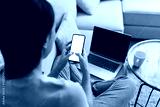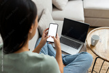 Beautiful woman working with her laptop while using mobile phone sitting on a couch at home
