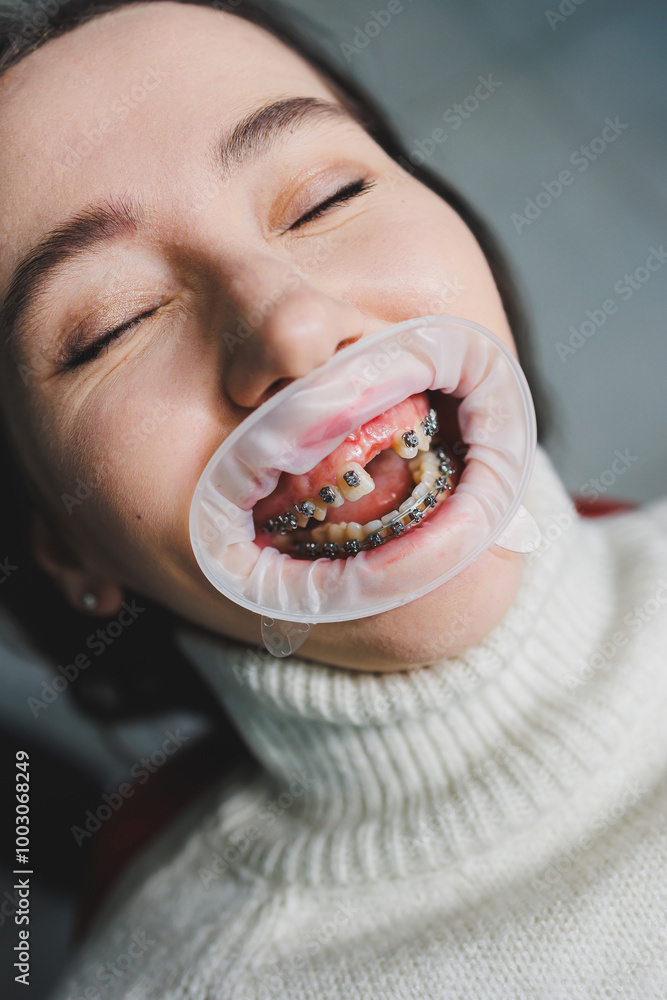 Braces on the teeth. Female jaw without one tooth. Installation of braces on the teeth.