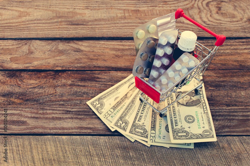 Shopping cart with pills, a syringe, candles, dollars on the old wood background. Toned image.