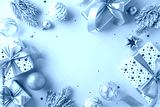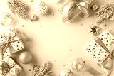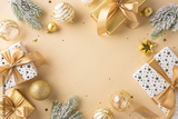 Stylish Christmas presents wrapped in gold and white with festive decorations, including ornaments and pine branches, creating a luxurious holiday atmosphere