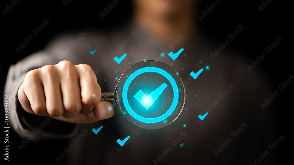 Businessman holding a magnifying glass, showing Audit Document concept,quality assessment management With a checklist, business document evaluation process, market data report analysis and consulting