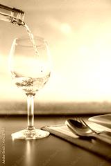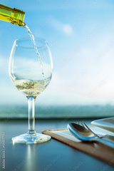 White wine pouring into wine glass. Fine dinning concept.