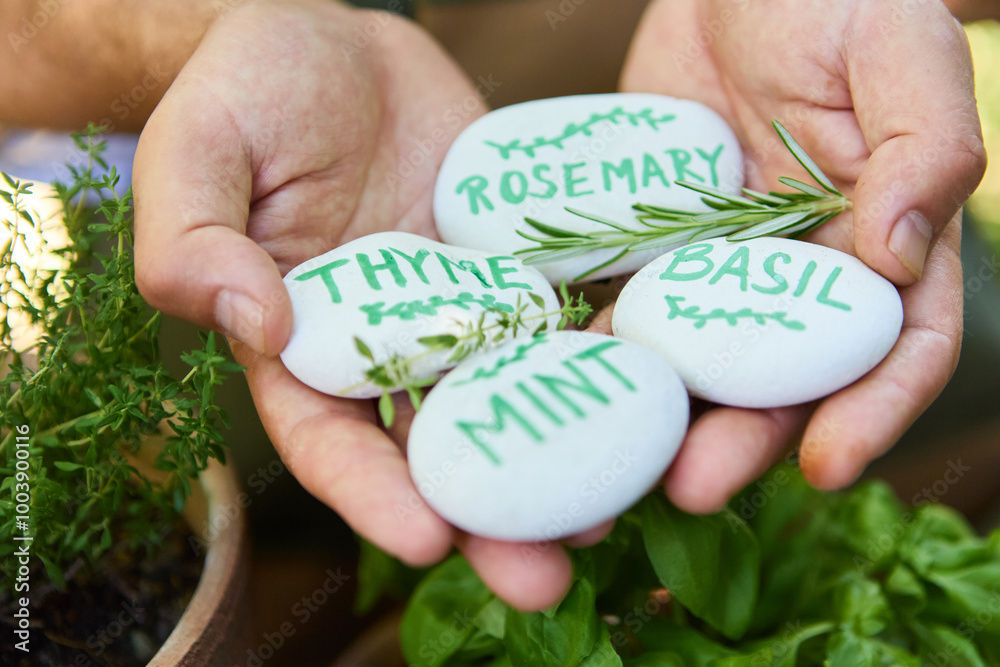 Hands holding labeled stones for rosemary, thyme, basil, and mint in a garden setting