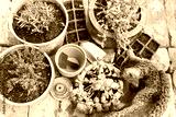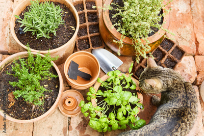 Cat exploring garden with potted herbs and gardening tools on brick patio