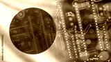 Microelectronics industry in Japan. Fragment of digital board. Supply of microelectronics from Japan. PCB with national flag. Semiconductor exports to Japan. Microelectronics manufacturing. 3d image