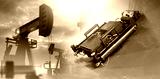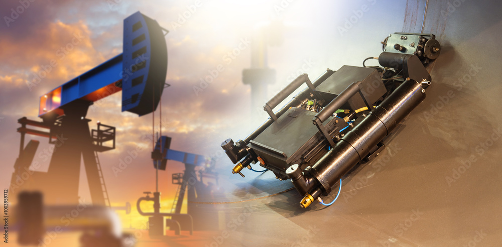 Oil production technologies. Robot inside pipe for transporting petroleum. Oil pumps at oil field. Fuel production technologies. Robot for automatic pipe welding. Petroleum derricks at sunset