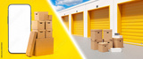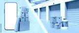 Self storage rooms. Mock up mobile phone near boxes. Smartphone with white screen. Self storage rooms with closed gates under blue sky. Street storage rooms. Warehouses for private clients. 3d image